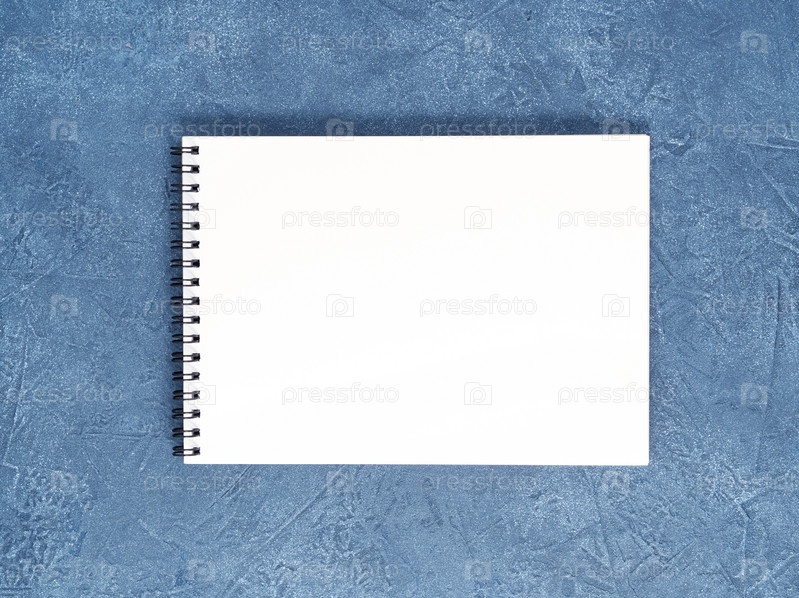 Открытый блокнот с чистой белой страницей на состаренном темно-синем каменном столе, вид сверху