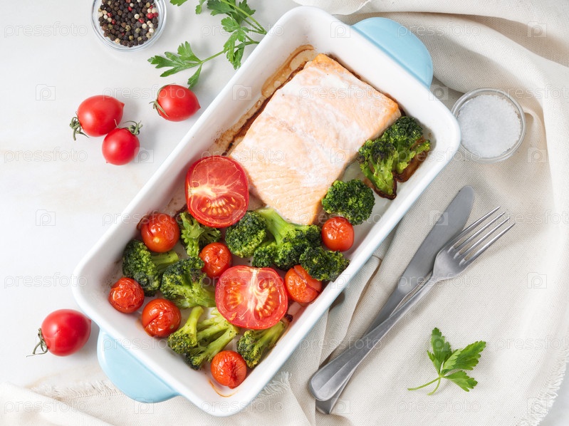 Рыба лосось запеченная в духовке с овощами - брокколи, помидорами. Здоровое диетическое питание, белый мраморный фон, вид сверху