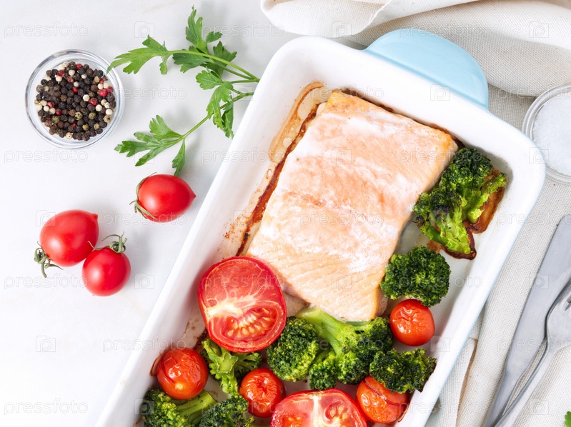 Рыба лосось запеченный в духовке с овощами - брокколи, помидоры. Здоровое диетическое питание, белый мраморный фон, вид сверху, крупный план