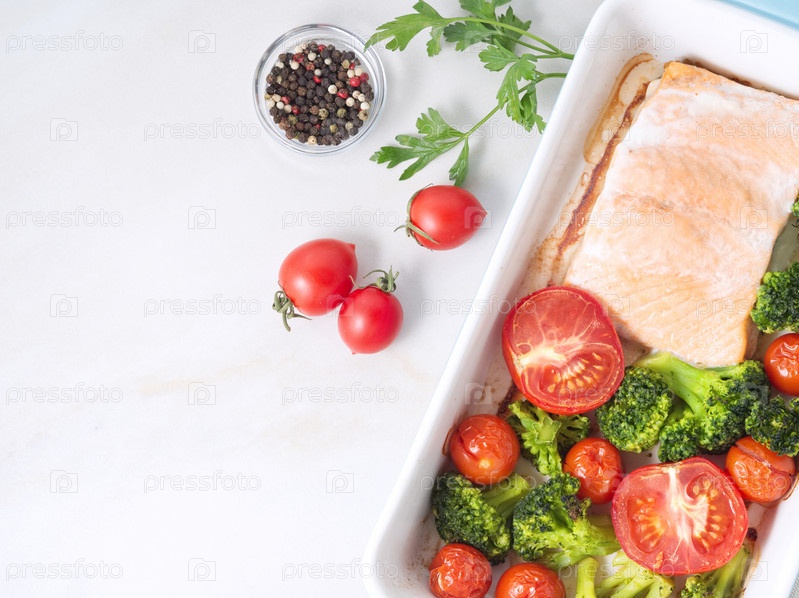 Рыба лосось запеченный в духовке с овощами, брокколи. Здоровое диетическое питание, белый мраморный фон, вид сверху, крупный план