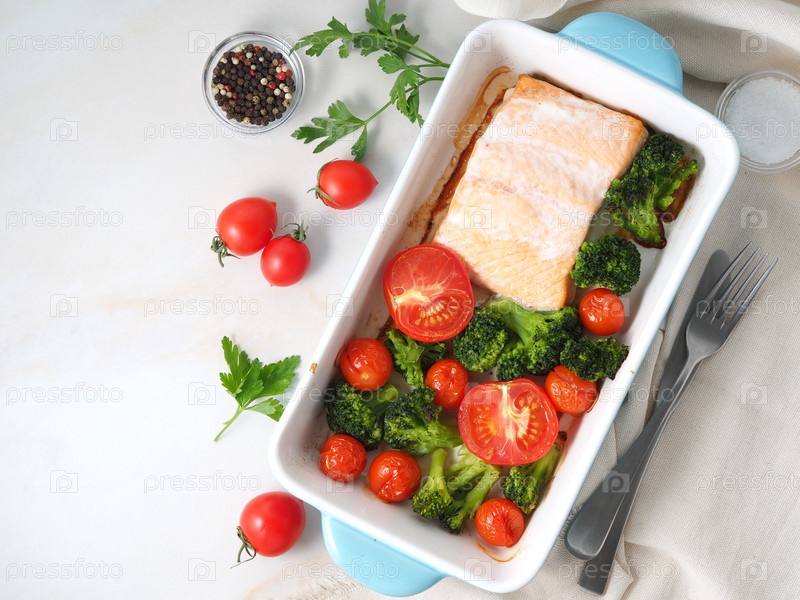 Рыба лосось запеченная в духовке с овощами - брокколи, помидорами. Здоровое диетическое питание, белый мраморный фон, вид сверху