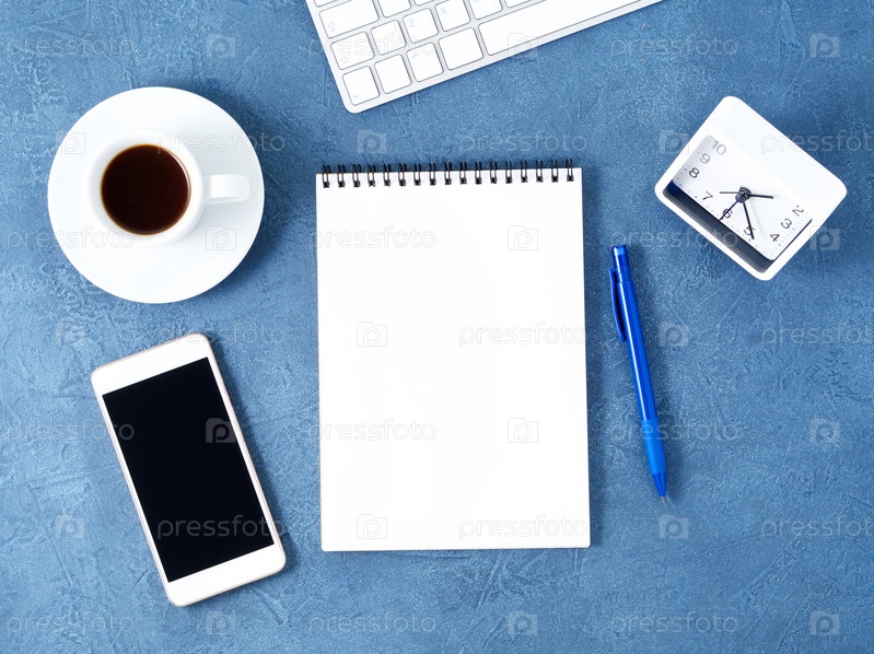 Открытый блокнот с чистой белой страницей, ручкой и чашкой кофе на состаренном темно-синем каменном столе, вид сверху