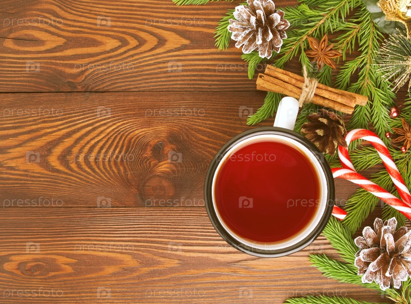 Рождество и Новый год фон с чаем. Вид сверху, копия пространства. Еловые ветки, коричневый темный деревянный стол