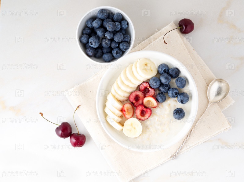 Большая миска вкусной и полезной овсянки с фруктами и ягодами на завтрак, утренний прием пищи