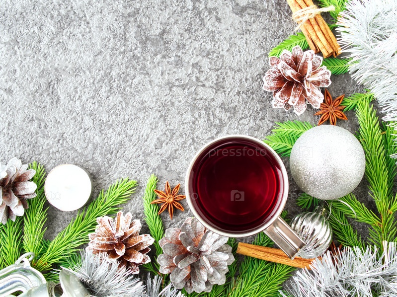 Рождество и Новый год фон с чаем. Вид сверху, копия пространства. Еловые ветки, серебристый бетон