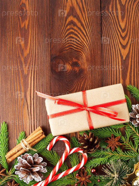 Рождество и Новый год темно-коричневый фон. Подарочная рождественская коробка, деревянный стол, вид сверху, пространство для копирования, вертикальный