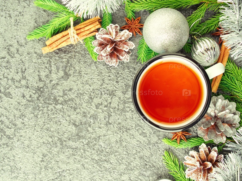 Рождество и Новый год фон с чаем. Вид сверху, копия пространства. Еловые ветки, серебристый бетон