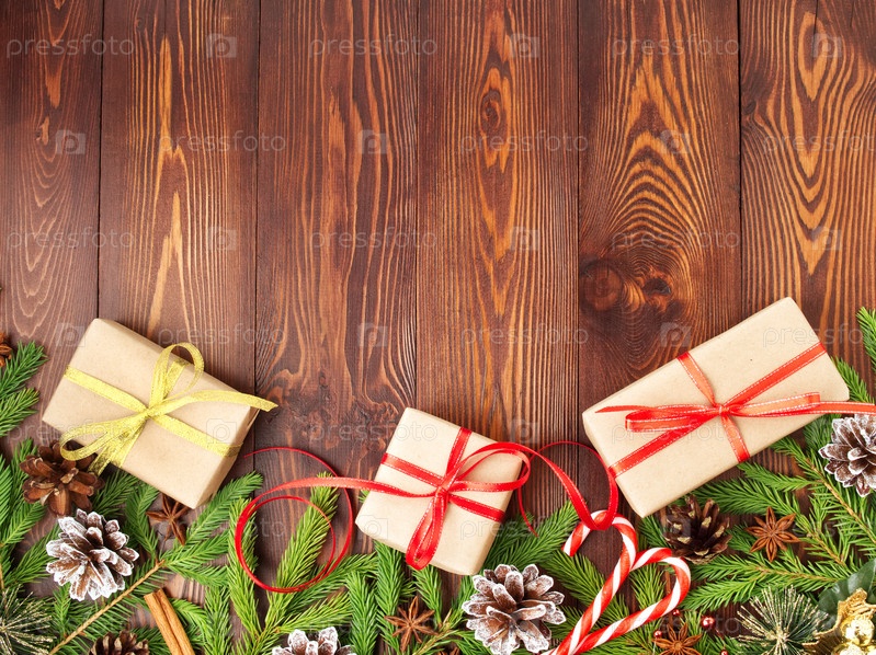 Рождество и Новый год темно-коричневый фон. Подарочная рождественская коробка, еловые ветки