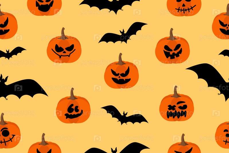 Счастливого Хэллоуина с тыквами и летучими мышами. Бесшовный узор. Векторная иллюстрация. Вектор