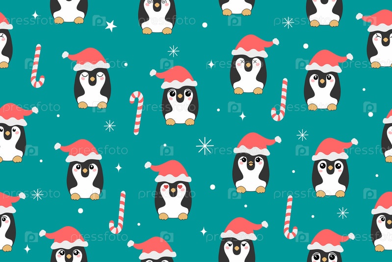 Бесшовный узор с двумя милыми пингвинами в зимней шапке Санта-Клауса на синем фоне с белыми снежинками. Векторная иллюстрация