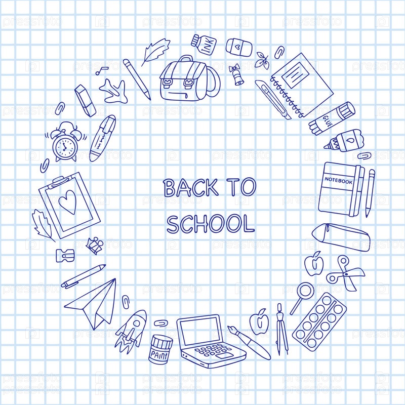 Баннер «Назад в школу». Набор рисунков канцелярских принадлежностей, нарисованных от руки. Школьные принадлежности в стиле каракули. Векторная иллюстрация. Вектор