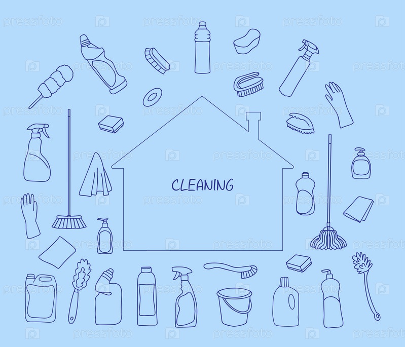 Набор уборочного инвентаря. Значки линии уборки. Линия нарисованного от руки инвентаря, чистящих средств и инструментов для мытья и дезинфекции дома, ведро и швабра, распылитель моющего средства