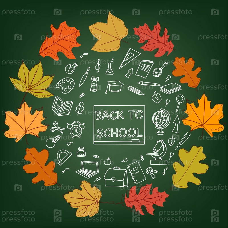 Баннер "Назад в школу". Набор канцелярских принадлежностей и осенних листьев. Школьные принадлежности в стиле каракули. Вектор
