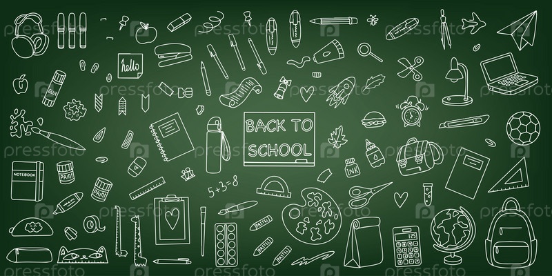 Набор рисованных канцелярских дизайнов на зеленом фоне. Концепция «Назад в школу». Школьные принадлежности в стиле каракули. Вектор