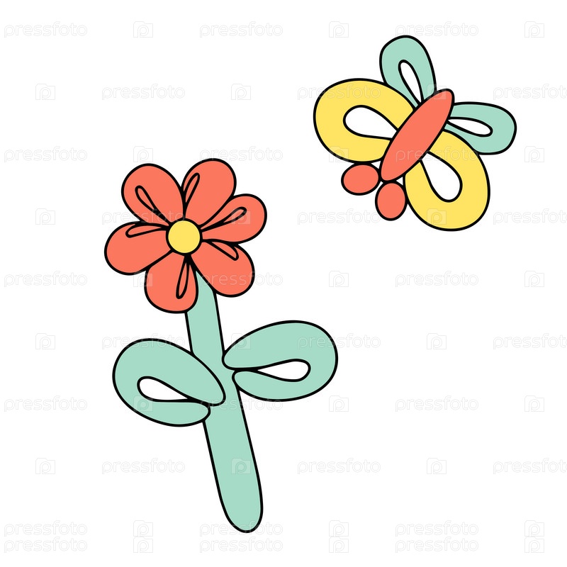 Цветок из гелиевого шара. Игрушки для детского фестиваля, дня рождения. Развлекательное оборудование, бабочка, цветок, домашние животные. Векторная ручная иллюстрация. Векторная иллюстрация