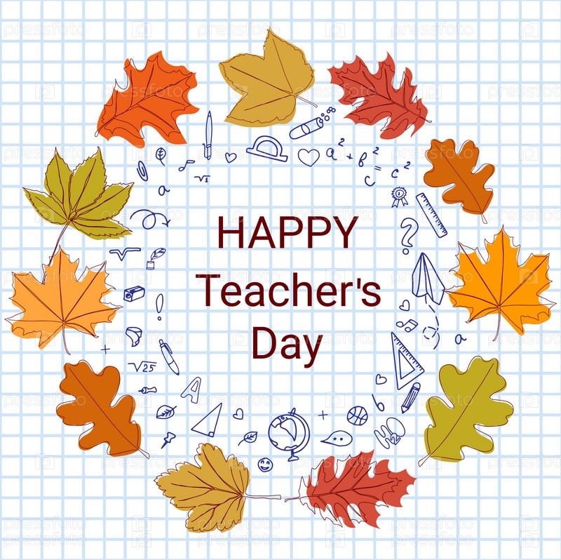 Векторная открытка с Днем учителя с надписями. Дизайн поздравительной открытки, макета, логотипа, марки или баннера ко Дню учителя. Нарисованные от руки школьные принадлежности и листья