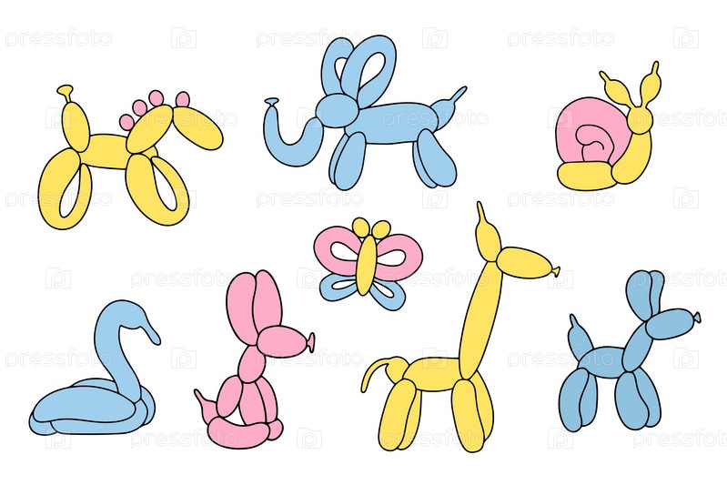 Набор разноцветных шаров. Красочный рисунок надувных игрушек из скрученных шаров. Элемент дизайна для поздравительной открытки, пригласительного билета, печати, флаера, баннера