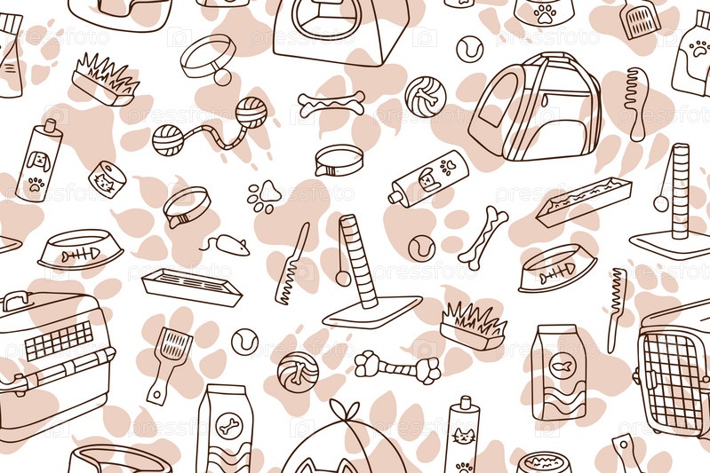 Бесшовный узор с нарисованным от руки ассортиментом зоомагазина в стиле каракули