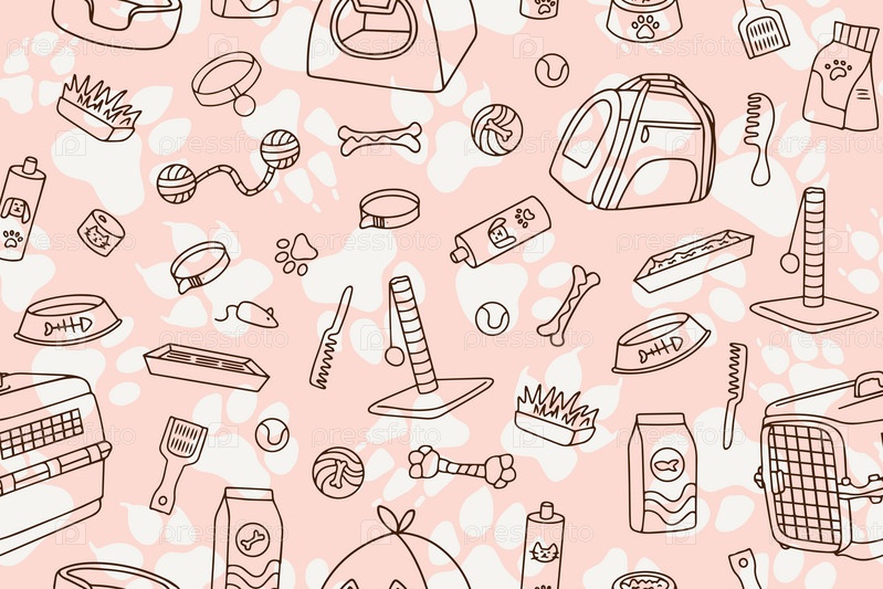 Бесшовный узор с нарисованным от руки ассортиментом зоомагазина в стиле каракули