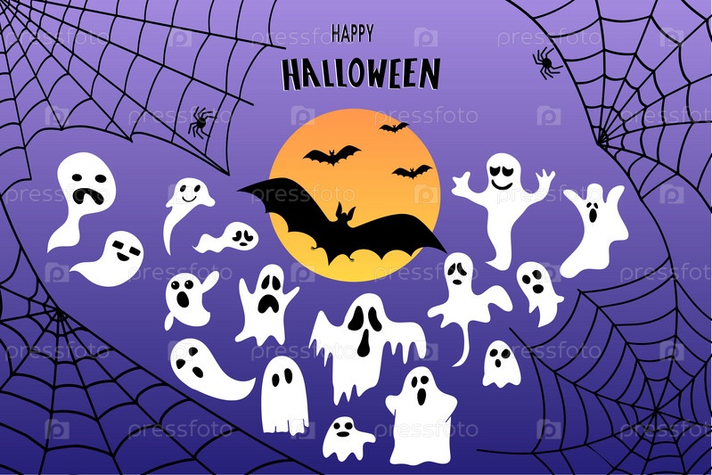 Милые осенние фоны с привидениями, паутиной, летучими мышами. Красочный векторный шаблон для поста в социальных сетях, флаера, дизайна открытки. Вектор