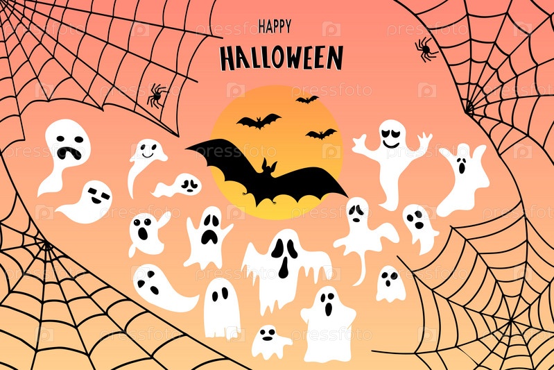 Милые осенние фоны с привидениями, паутиной, летучими мышами. Красочный векторный шаблон для поста в социальных сетях, флаера, дизайна открытки. Вектор