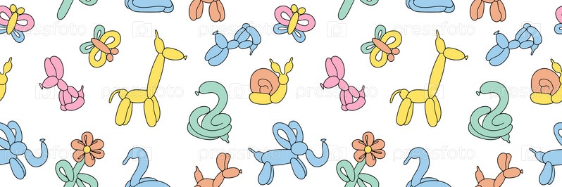 Бесшовный узор из разноцветных шаров. Красочный рисунок надувных игрушек из скрученных шаров. Элемент дизайна для упаковки, поздравительной открытки, пригласительного билета, печати, флаера, баннера. Вектор