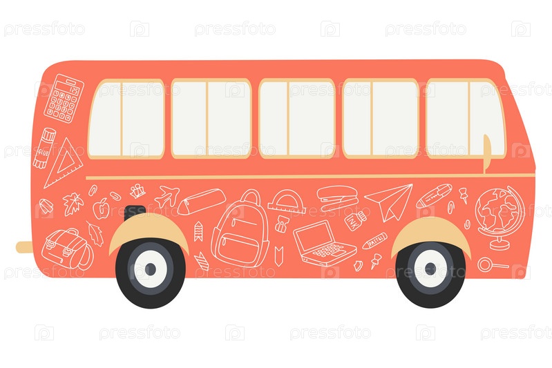 Модный школьный автобус и школьные канцелярские принадлежности в стиле дудл