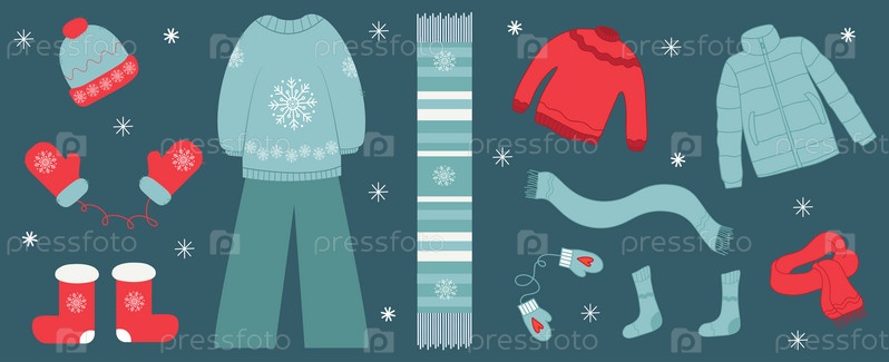 Комплект зимней одежды и аксессуаров в плоском и каракули стиле. Вектор
