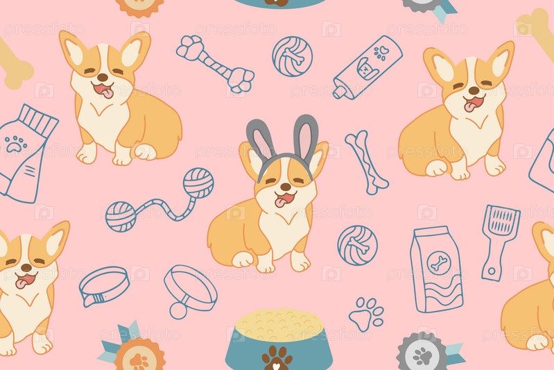 Бесшовный векторный узор с милыми собаками корги, едой и аксессуарами для собак. Векторная иллюстрация