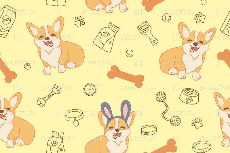 Бесшовный векторный узор с милыми собаками корги, едой и аксессуарами для собак. Векторная иллюстрация