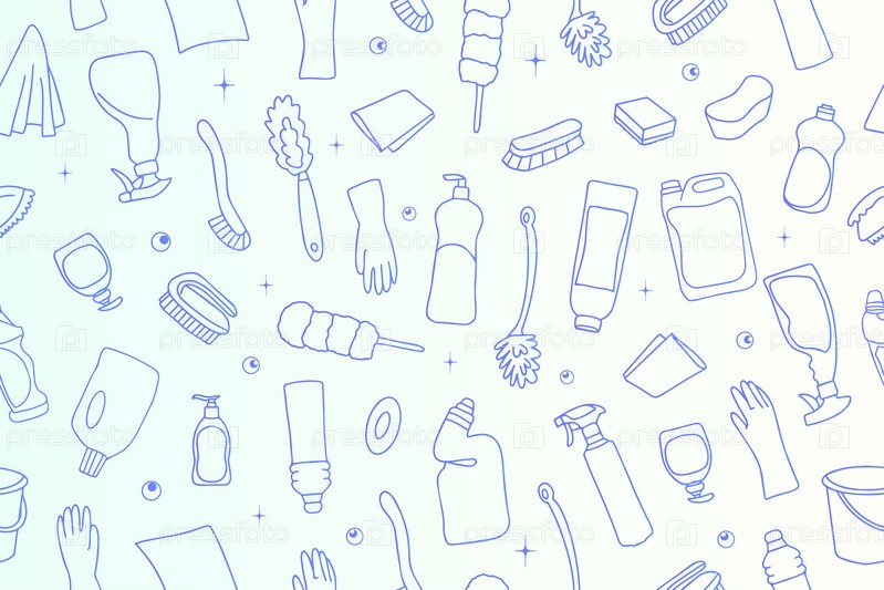 Бесшовный узор из уборочного оборудования. Значки линии уборки. Линия нарисованного вручную оборудования, чистящих средств и инструментов для мытья и дезинфекции дома, ведро и швабра, распылитель моющего средства. Вектор