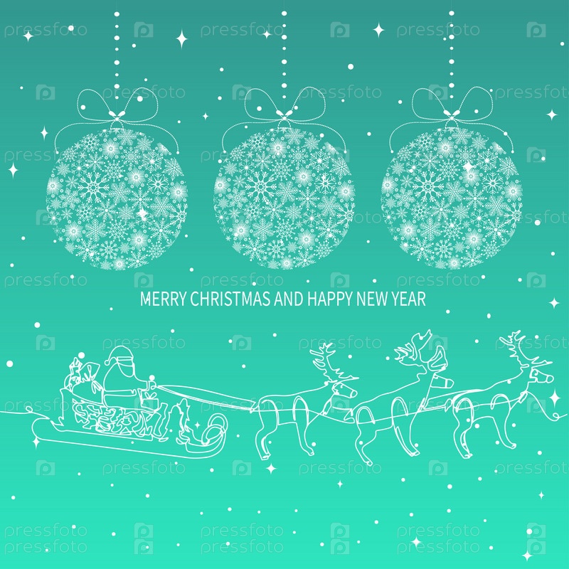 Рождественская открытка с Сантой, санями и оленями. Иллюстрация в одну линию
