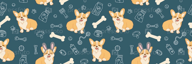 Бесшовный векторный узор с милыми собаками корги, едой и аксессуарами для собак. Векторная иллюстрация