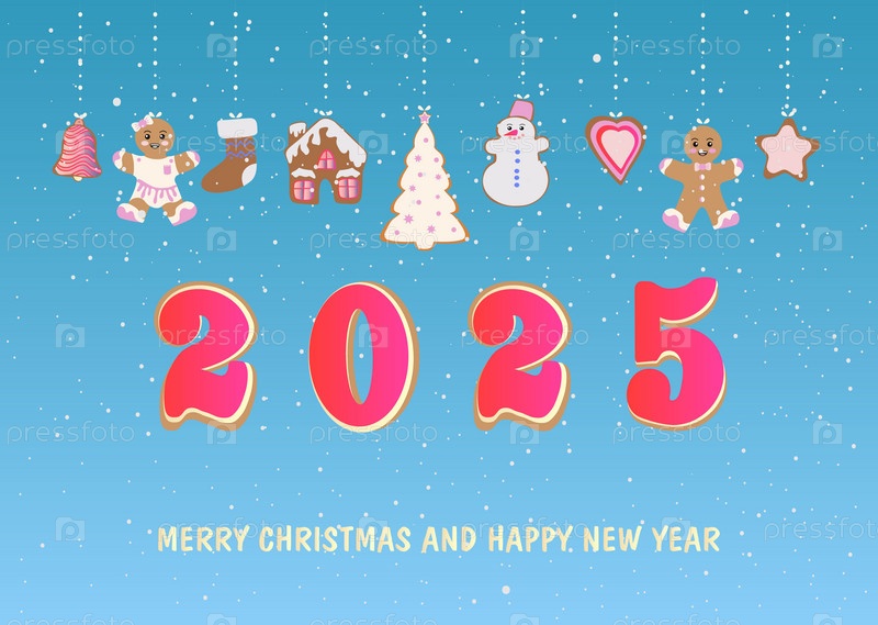 Поздравительная открытка с Рождеством и Новым годом 2025. Рождественская открытка с пожеланиями и композицией из праздничных элементов и пряников