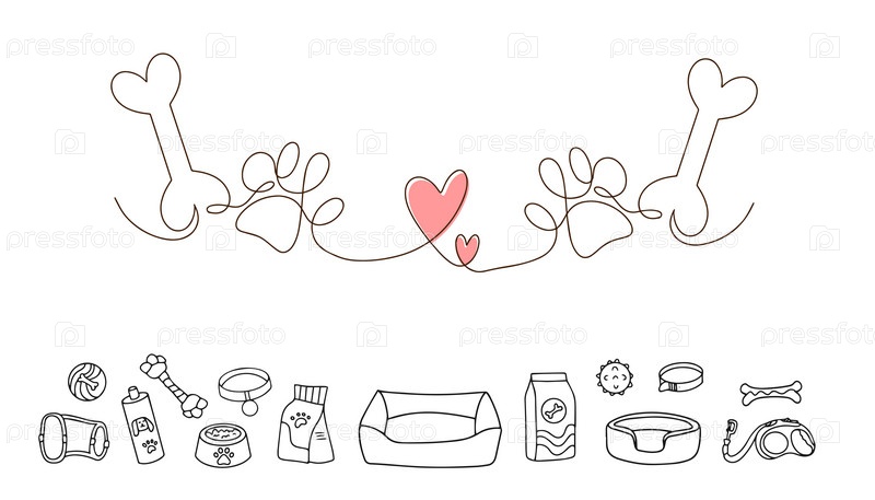 Сердце, лапа животного, кость в одну линию. Иконы doodle товаров для домашних животных в зоомагазине. Концепция любви. Векторная иллюстрация