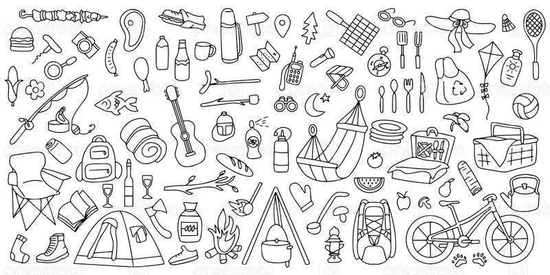 Ручно нарисованная тема пикника, путешествий и кемпинга. стиль Doodle
