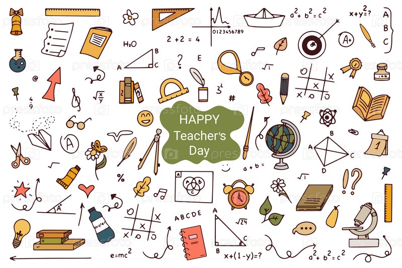 С Днем учителя - нарисованный от руки плакат со школьными принадлежностями и уравнениями. Отличные элементы дизайна типографики для поздравительных открыток, баннеров и листовок