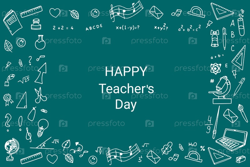 С Днем учителя - нарисованный от руки плакат со школьными принадлежностями и уравнениями. Отличные элементы дизайна типографики для поздравительных открыток, баннеров и листовок