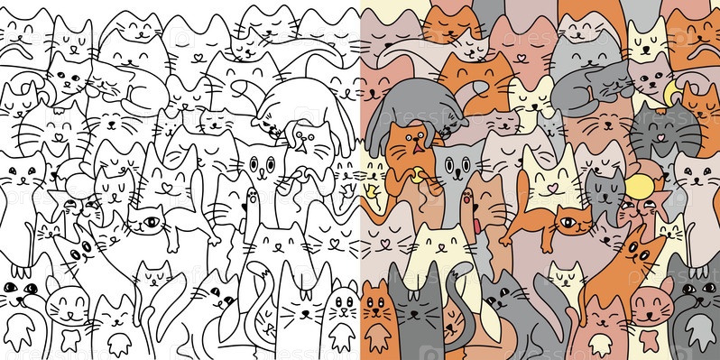 Много милых кошек. Фон из кошек. Раскраска. Векторная иллюстрация. Милые и забавные кошки каракули векторный набор. Коллекция дизайнов персонажей мультяшных кошек или котят с плоским цветом в разных позах