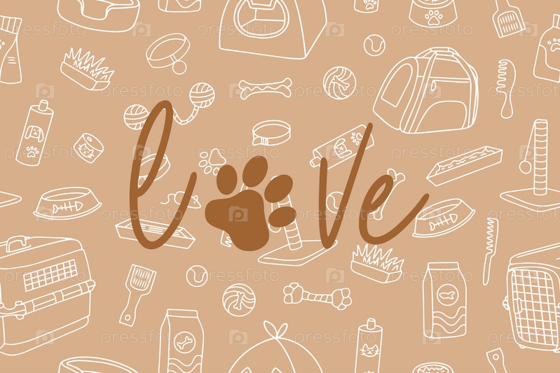 Рисованный ассортимент зоомагазина в стиле каракули. Векторная иллюстрация