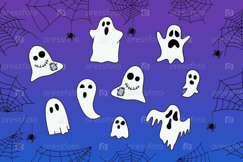 Милые осенние фоны с привидениями, паутиной. Красочный векторный шаблон для поста в социальных сетях, флаера, дизайна открытки. Вектор