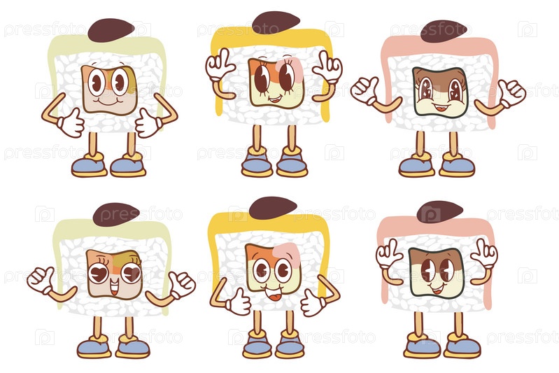 Набор милых кавайных иконок суши и роллов с улыбающимися лицами. Блюда японской традиционной кухни. Можно использовать для печати на футболках, наклейках, поздравительных открытках, дизайне меню