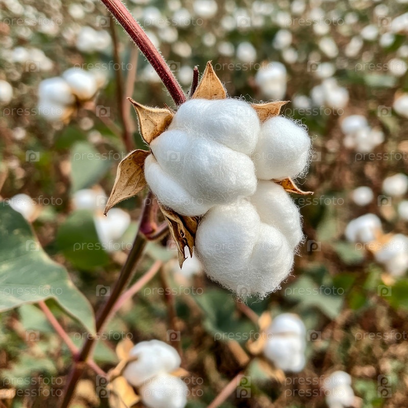 Крупный план коробочки хлопка на стебле растения на размытом фоне хлопкового поля
