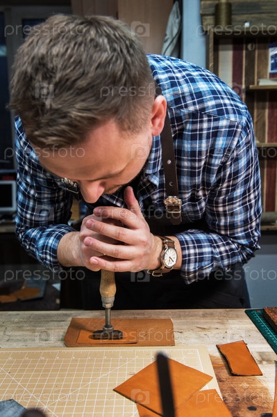 Мужчина работает с кожаным текстилем в мастерской