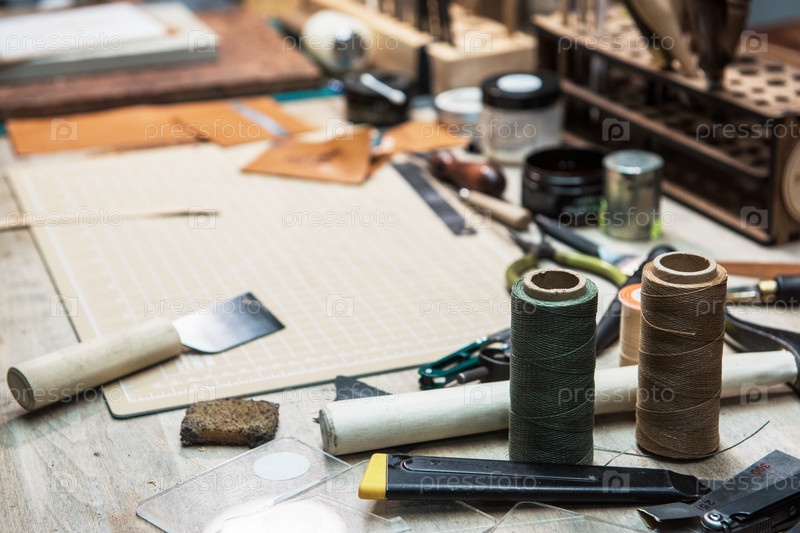 Рабочий стол кожевника. Инструменты и кожа на рабочем месте сапожника. Инструменты для ремесленного производства изделий из кожи на деревянном столе