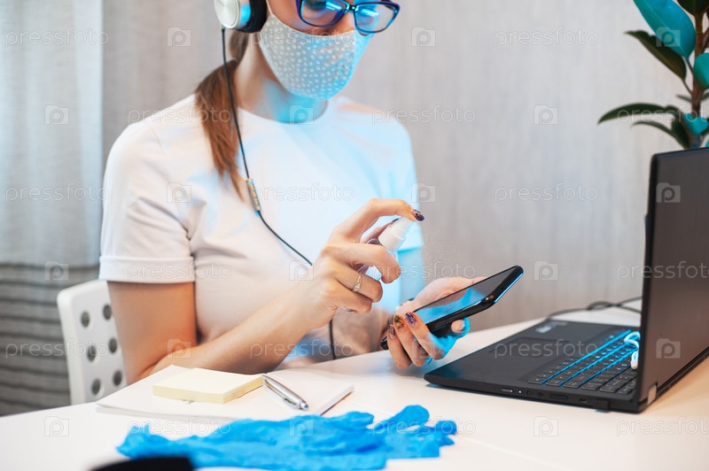 Женщина дезинфицирует поверхность телефона с помощью дезинфицирующего спрея на рабочем месте