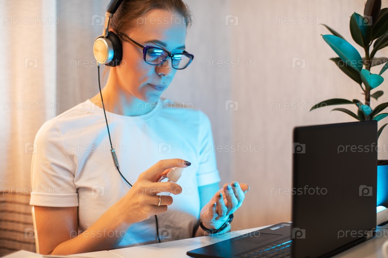 Женщина дезинфицирует поверхность телефона с помощью дезинфицирующего спрея на рабочем месте