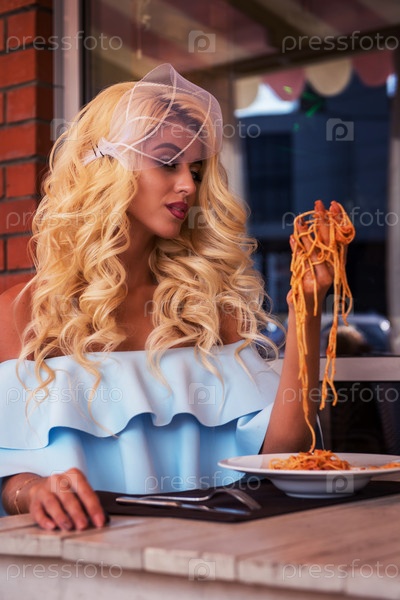 Креативная концепция еды, людей и досуга - красивая блондинка молодая женщина ест пасту в кафе