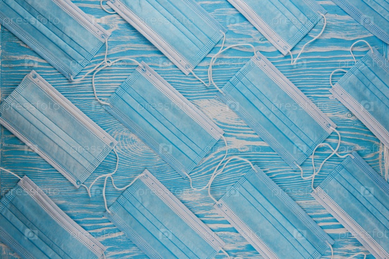 Медицинские маски на синем фоне для защиты от коронавируса. Концепция эпидемии и здравоохранения, узор, плоская планировка