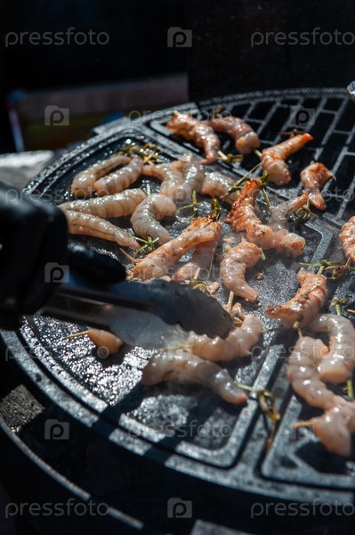 Профессиональный повар готовит креветки на гриле на открытом воздухе, концепция питания или кейтеринга